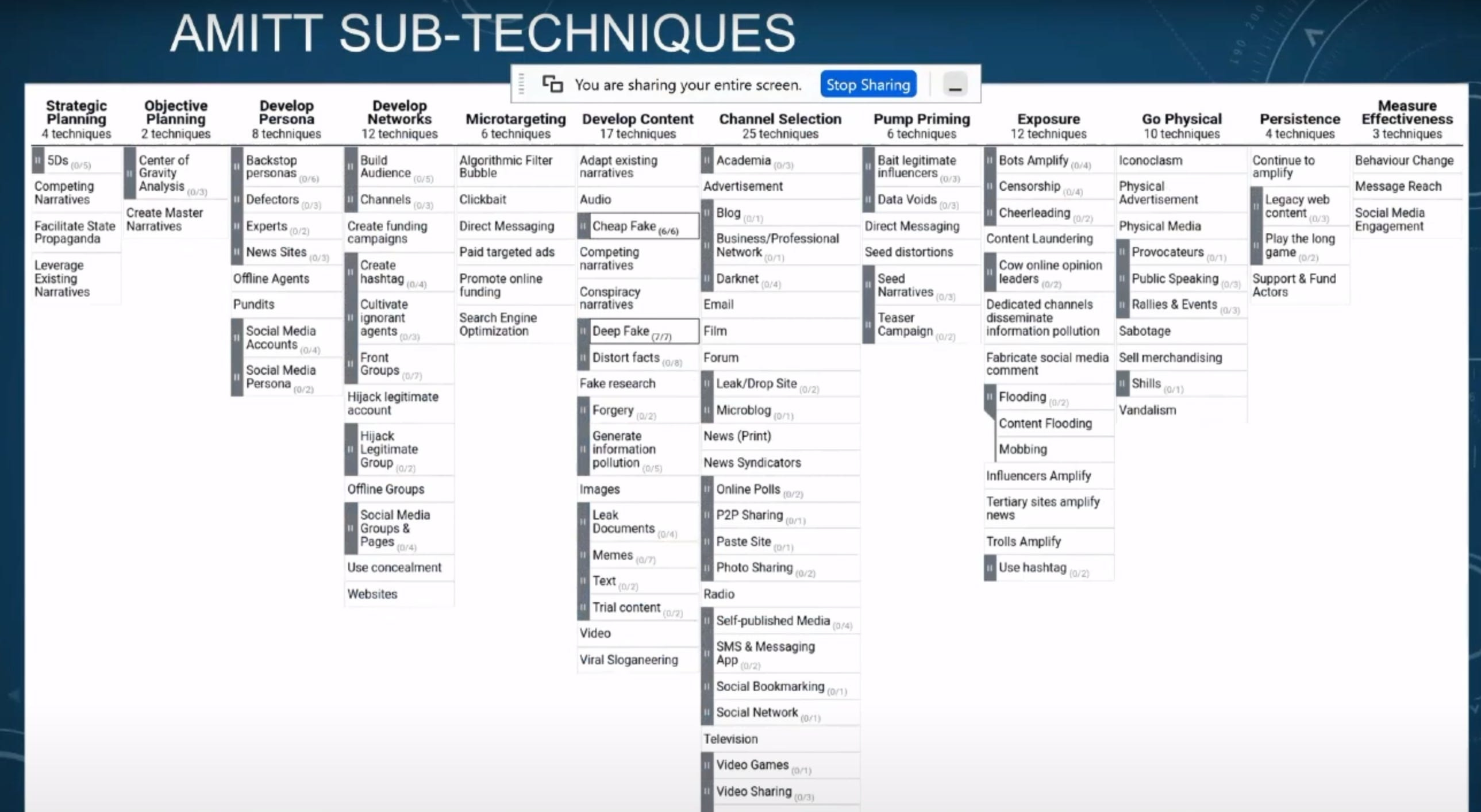 Skupina Misinfosec nakoniec vyvinula štruktúru na katalogizáciu dezinformačných techník, ktorá vychádza z rámca ATT&CK. V súlade s toleranciou ich odboru k akronymom ju nazvali AMITT (Adversarial Misinformation and Influence Tactics and Techniques – Misinformačné a ovplyvňovacie taktiky a techniky protivníka). Doteraz identifikovali viac ako 60 techník, pričom ich zmapovali na fázy útoku. Technikou 49 je zaplavovanie, teda používanie botov alebo trollov, ktorí ovládnu konverzáciu tým, že zverejnia také množstvo materiálu, že prehlušia ostatné myšlienky. Technikou 18 sú platené cielené reklamy. Technikou 54 je zosilňovanie pomocou botov na Twitteri. Databáza sa však ešte len začína.