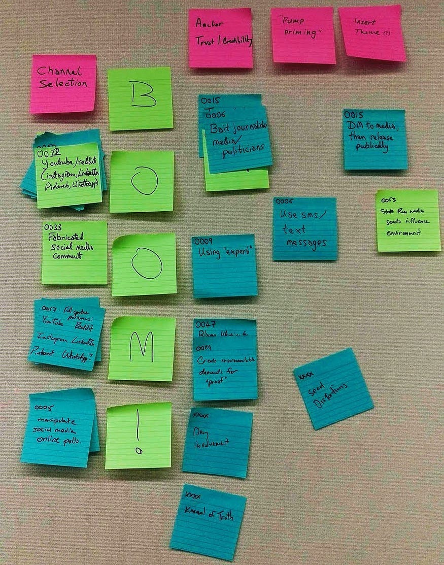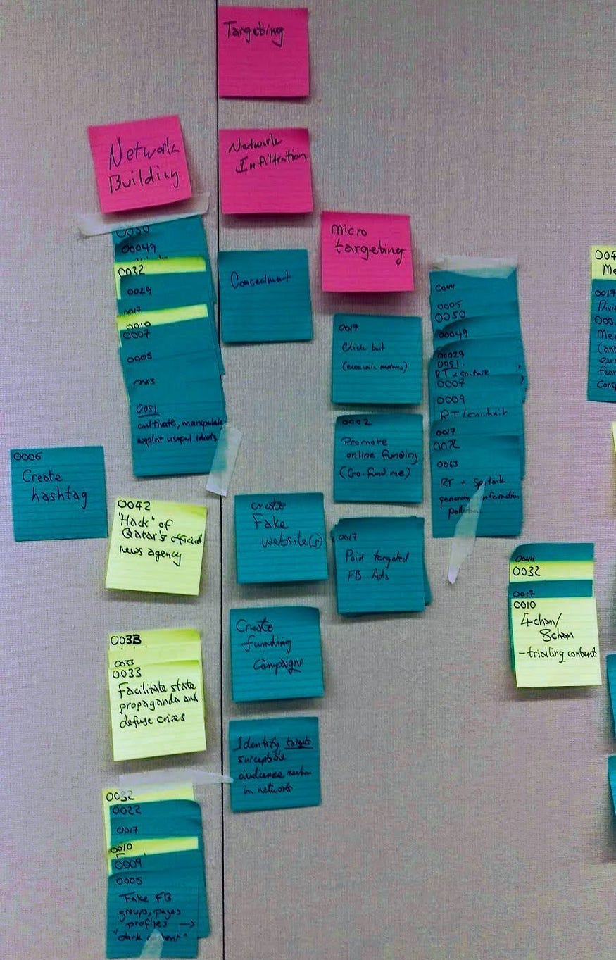 Zostavili zoznam "incidentov" v sociálnych médiách. Preštudovali ich, aby zistili, aké "techniky" za nimi stojaci pokročilí perzistentní manipulátori používajú, a tieto techniky si zapísali na stovky farebne označených lepiacich papierikov. Techniky z incidentov spojených s Ruskom sa dostali na "modré" lepiace papieriky (v skutočnosti sa mi zdajú tyrkysové) a techniky "neruskej atribúcie" sa dostali na fluorescenčné žlté lepiace papieriky. Terp vysvetľuje, že ich miestnosť bola "ako naše laboratórium na celý deň", takže môžeme predpokladať, že si predstavuje, že písanie vecí na samolepiace papieriky je to, čo musí byť vo vede.