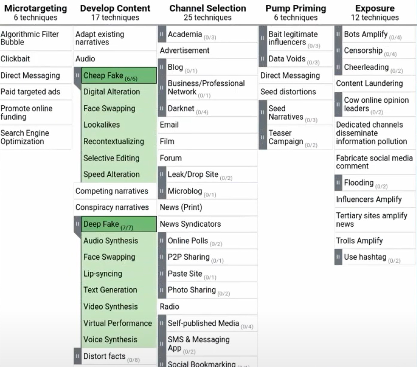 Terp si dala za cieľ rozšíriť túto pochybnú zbierku hesiel a nezmyselných diagramov "na vytvorenie rámca dezinformácií, fáz, techník a odpovedí". "Techniky" sú veci, ktoré "pokročilí vytrvalí manipulátori" používajú na nabúranie sa do myslí na sociálnych sieťach, "štádiá" sú procesy, ktorými to dosahujú, a "reakcie" sú "úspešné proti-opatrenia", ktoré proti nim Terp a ostatní bojovníci MisinfoSecu môžu nasadiť.