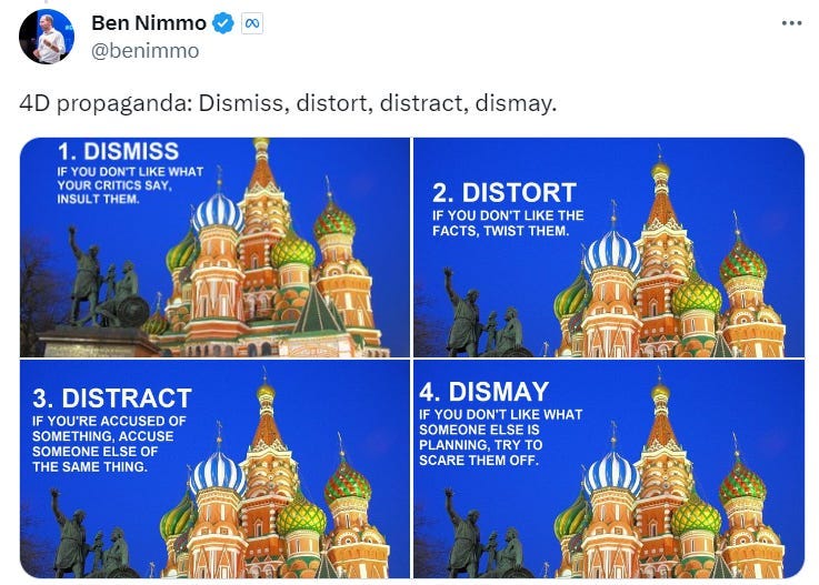 Mimochodom, tieto techniky sa naozaj oplatí čítať. Technika "0009" používa pravopis "experb" na označenie expertov. Je na modrom lepiacom papieriku, takže je to ruština. Technika "0033" zahŕňa "vymyslené komentáre na sociálnych sieťach" a je na žltom lepiacom papieriku, takže to asi Rusi nerobia. Technika "0006" je "vytvorenie hashtagu" a technika 0017 je "click bait". Doslova každá z týchto techník je svojím osobitným spôsobom idiotská.